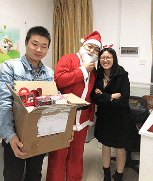 推開門走進(jìn)來,辦公室正放著悠揚(yáng)的音樂Merry Christmas,緩緩流淌的祝福溢滿了歸人的夢境。辦公區(qū)域,慈祥的圣誕老人微笑著拿著禮物等待上班的人兒,給他們帶來一天的喜悅和祝福。