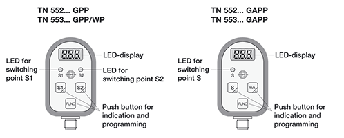 緊湊型號TN 552 GPP和TN 552/1 GPP有兩個獨立的可調節(jié)開關點。緊湊型號TN 552 GAPP和TN 552/1 GAPP具有一個獨立的可調節(jié)開關點和一個可擴展的4 ... 20 mA模擬輸出。