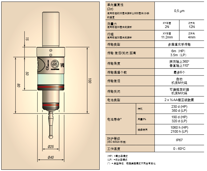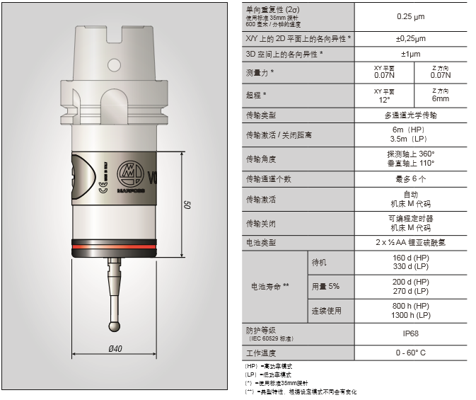 MARPOSS測頭VOP系列有多通道系統,每個應用可支持最多4個測頭;多主軸應用,可以在一個機床上同時用兩個測頭去實 施兩項應用 ;極度的萬能,緊湊和模塊化的配置可以出色的完成任何種類的應用;很大的操作范圍(超過6米,110度的傳輸角);電池壽命很長;安裝便捷,程序簡單。